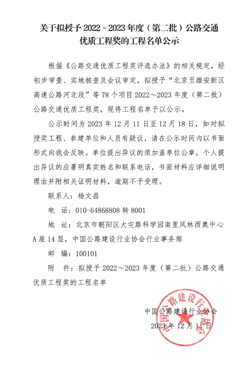 近日,中国公路建设行业协会发布了2022-2023年度(第一批)公路交通优质工程奖评选结果,由集团承建的G220 东深线长清陈庄至长清平阴界段改建工程项目荣获中国公路交通行业最高工程质量奖——公路交通优质工程奖(李春奖)。