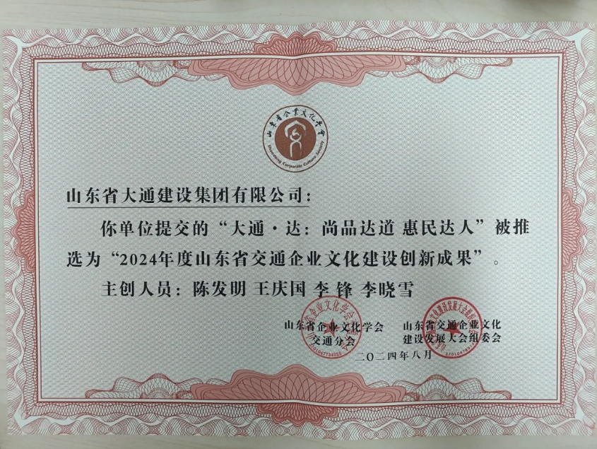 凭借在2023至2024年度文化建设方面的卓越表现,大通建设集团荣获“山东省交通企业文化建设创新成果”、“山东省交通企业文化建设先进单位”两项殊荣,充分彰显了集团在企业文化建设方面的深厚底蕴与显著成效。集团权属公司济南鸿润驾驶培训有限公司同时荣获“山东省交通企业文化建设先进班组”称号,进一步彰显了集团在企业文化建设方面的全面开花与硕果累累。
