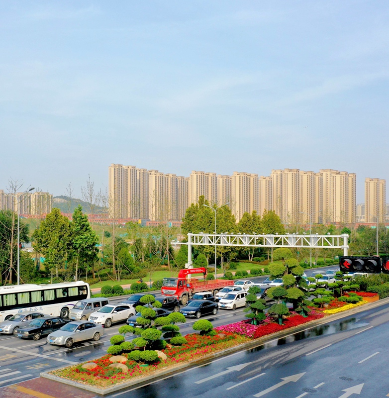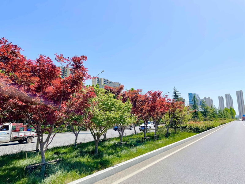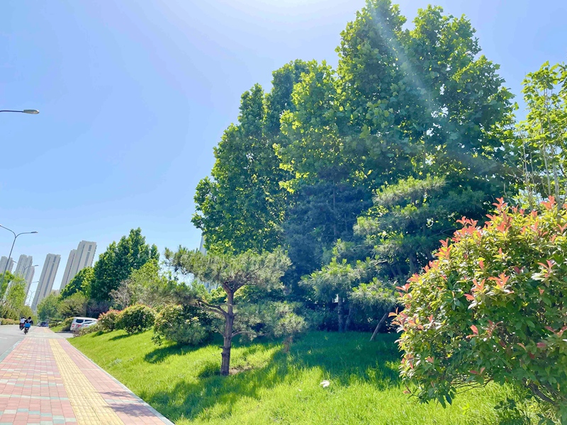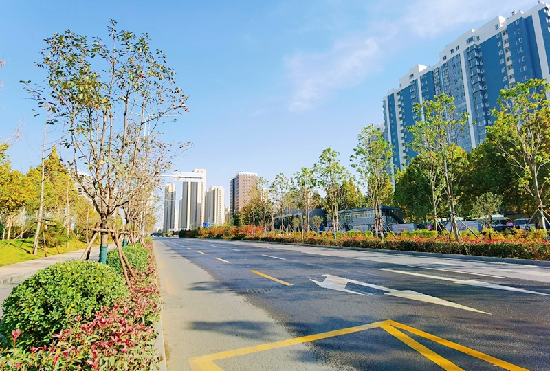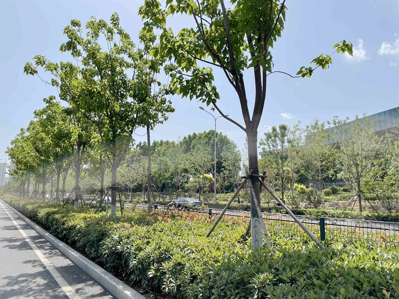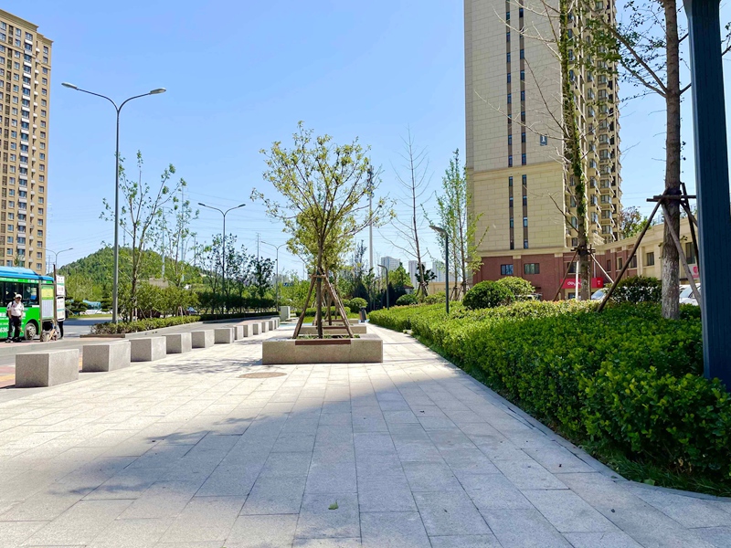 施工中坚持生态优先的原则,建设高标准的城市道路绿化体系,构成兼顾景观与生态功能的绿色长廊;坚持植物多样性,采用丰富的植物品种,乔灌花草地被相结合;坚持多形式表现,将节点广场、停车场、公交站牌、绿道、绿地充分融合,打造历城区园林绿化样板工程。