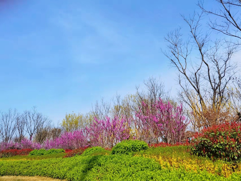 施工中遵循“春开百花夏绿荫,秋色缤纷冬常绿”的设计理念,充分运用多种乡土树种,创造不同生态景观,通过乔灌木的植物配置方式,形成简洁、大气的群落植物景观,达到“车在树中行,路在草中延,人在花中游,鸟在林中飞”的城市绿色廊道。