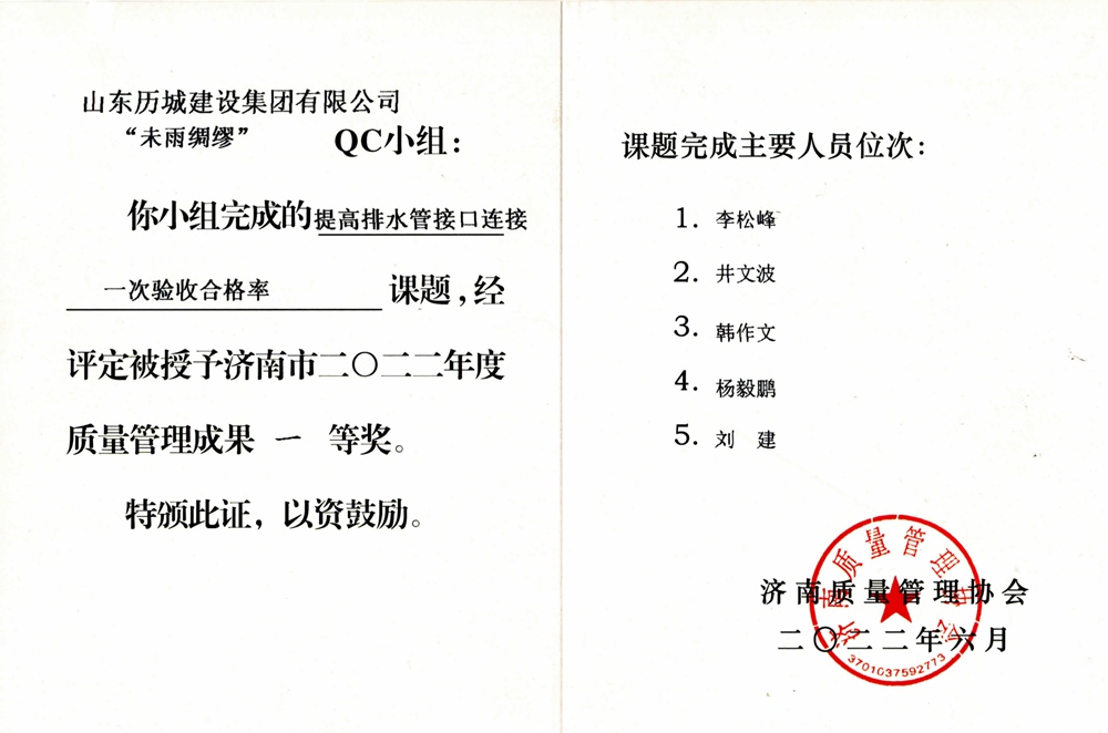 “未雨绸缪”QC小组-济南市2022年度质量管理成果一等奖