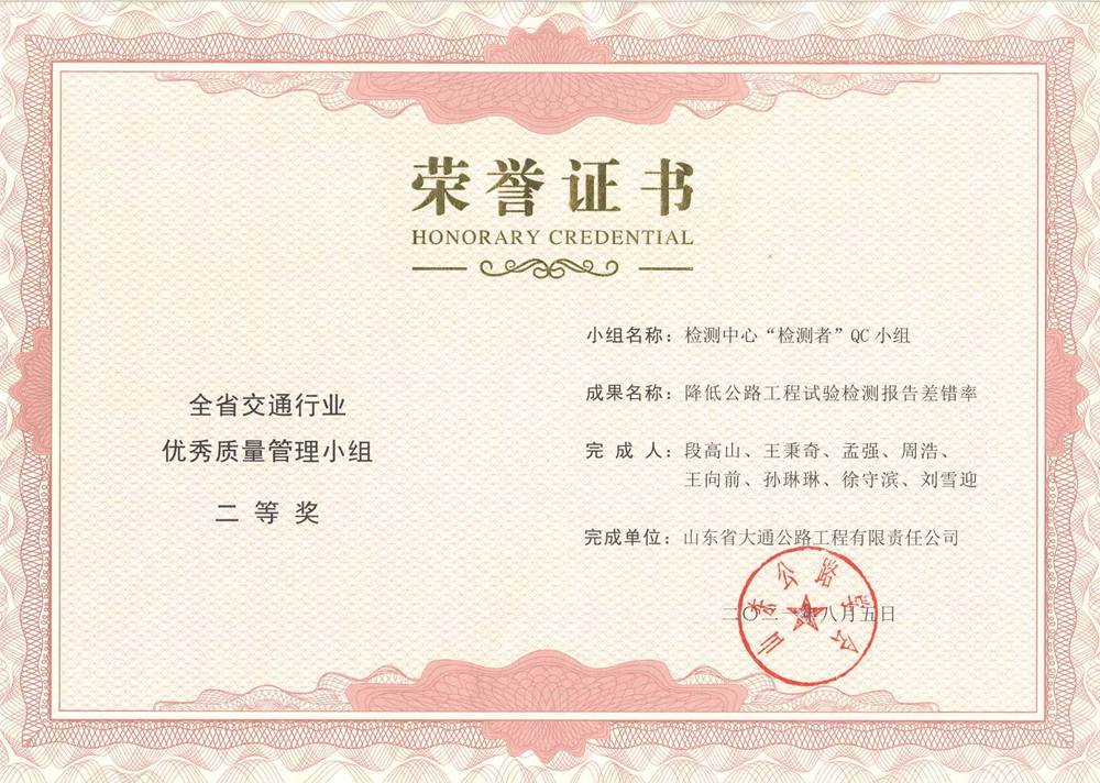 “检测者”QC小组-全省交通行业优秀质量管理小组二等奖