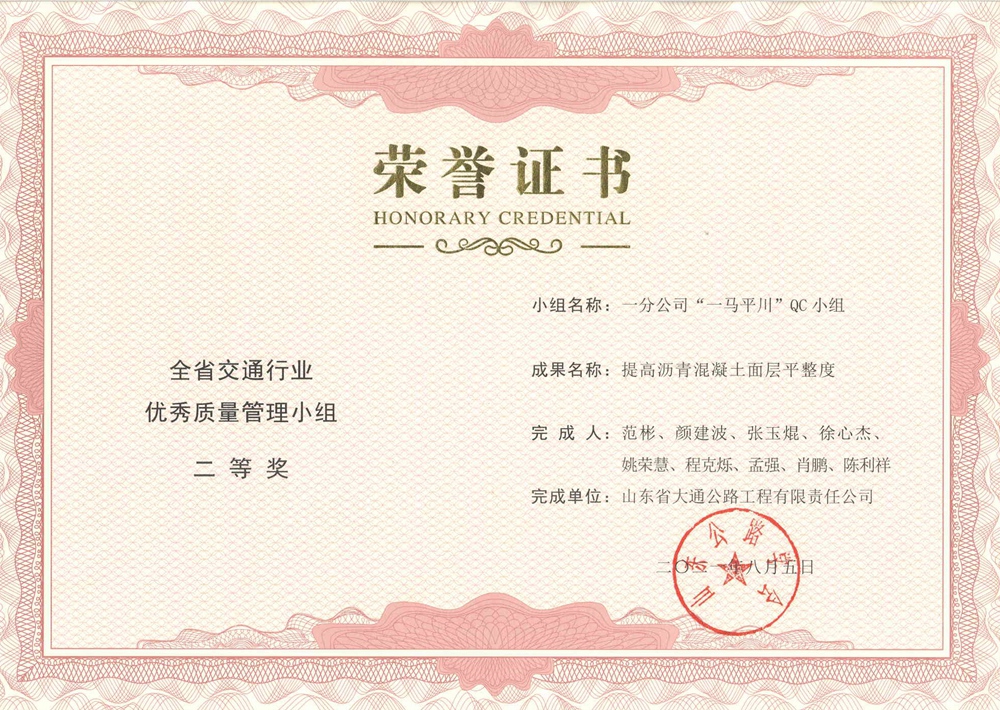 “一马平川”QC小组-全省交通行业优秀质量管理小组二等奖