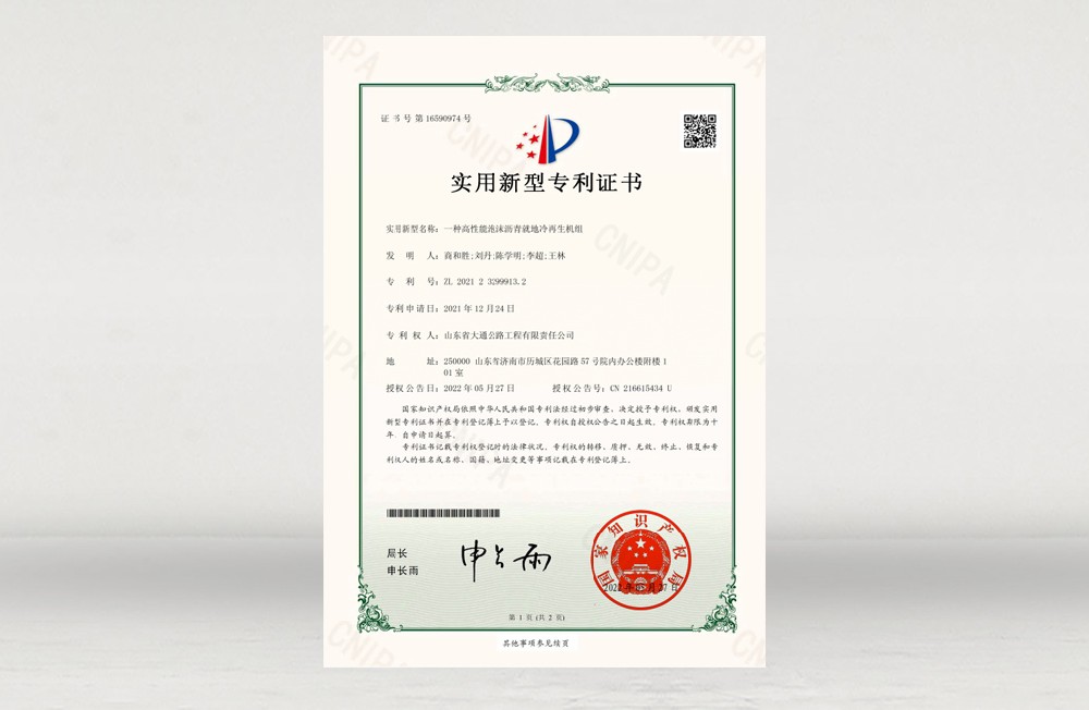 实用新型专利-高性能泡沫沥青就地冷再生机组