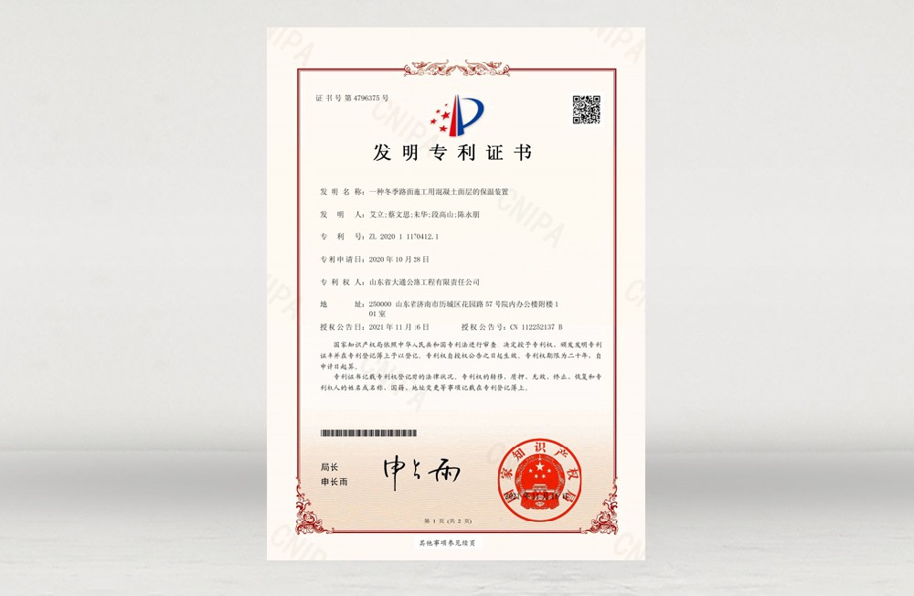 发明专利-冬季路面施工用混凝土面层的保温装置